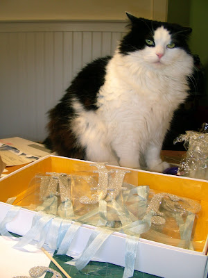 Teddy just has to be right smack in the middle of my workspace...when he's not sleeping, that is.......( that's his job the other 23 hours or so ) Notice how deftly he steps between the glittered letters...leaving only a trail of fur. And he knocks only the most delicate items off the worktable with such finesse...